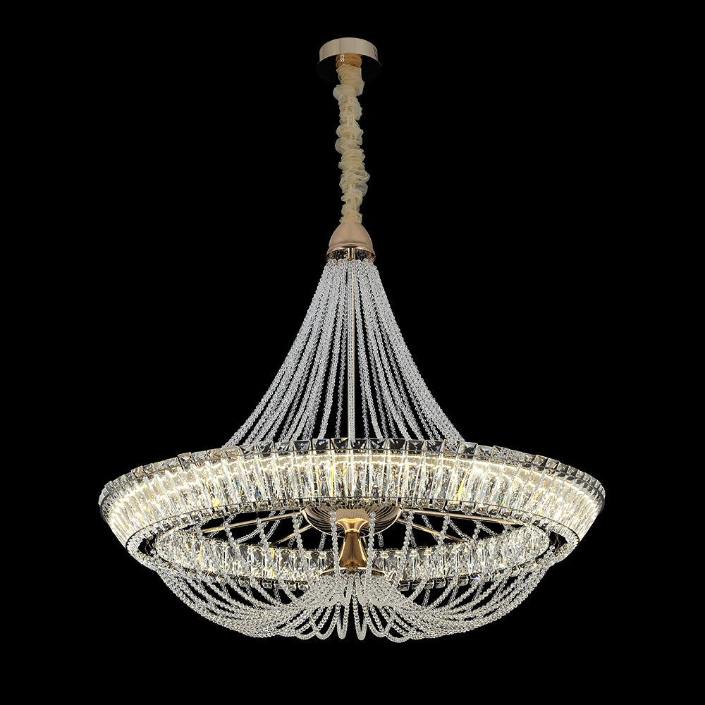 Además de su impresionante apariencia, este candelabro también es altamente funcional. Con múltiples luces, proporciona una iluminación brillante y uniforme en toda la habitación. Puede ajustar la intensidad de la luz según sus preferencias, creando diferentes ambientes y atmósferas. Ya sea que esté buscando una pieza central impresionante para su hogar o para un espacio comercial, este candelabro de cristal con acabado en oro seguramente cumplirá con todas sus expectativas de estilo y calidad.