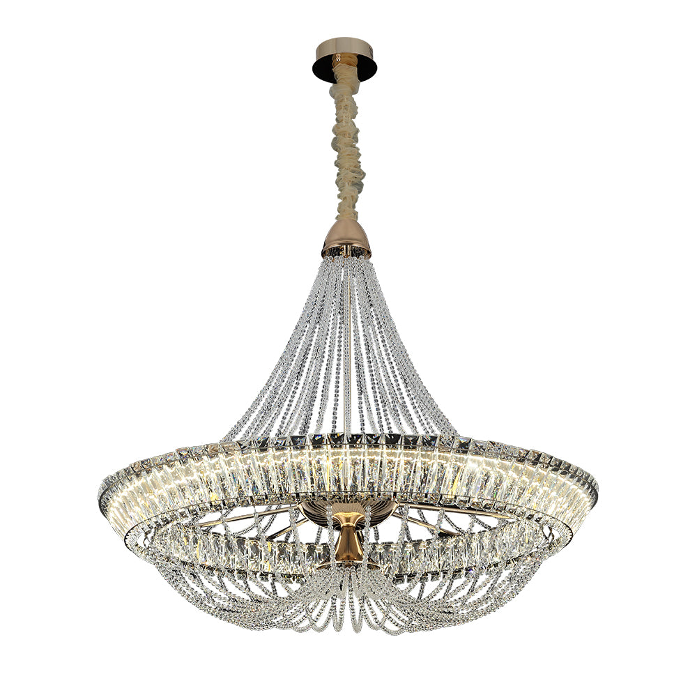 El diseño de este candelabro es exquisito y detallado. Cada cristal está cuidadosamente colocado para maximizar su brillo y reflejo. La estructura dorada complementa perfectamente los cristales, creando un contraste sofisticado y llamativo. Este candelabro es ideal para espacios amplios, como salones, comedores o vestíbulos, donde puede brillar y destacar su belleza.