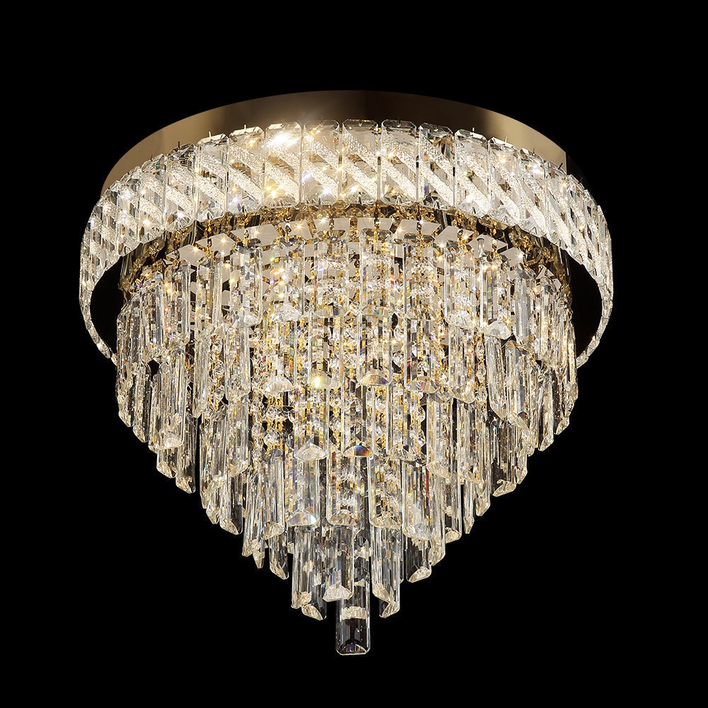 Este impresionante candelabro de cristal es una verdadera obra maestra de elegancia y lujo. Con un acabado en oro, esta pieza es el complemento perfecto para cualquier espacio que busque añadir un toque de sofisticación y glamour. Sus cristales brillantes reflejan la luz de una manera deslumbrante, creando un ambiente cálido y acogedor en cualquier habitación.